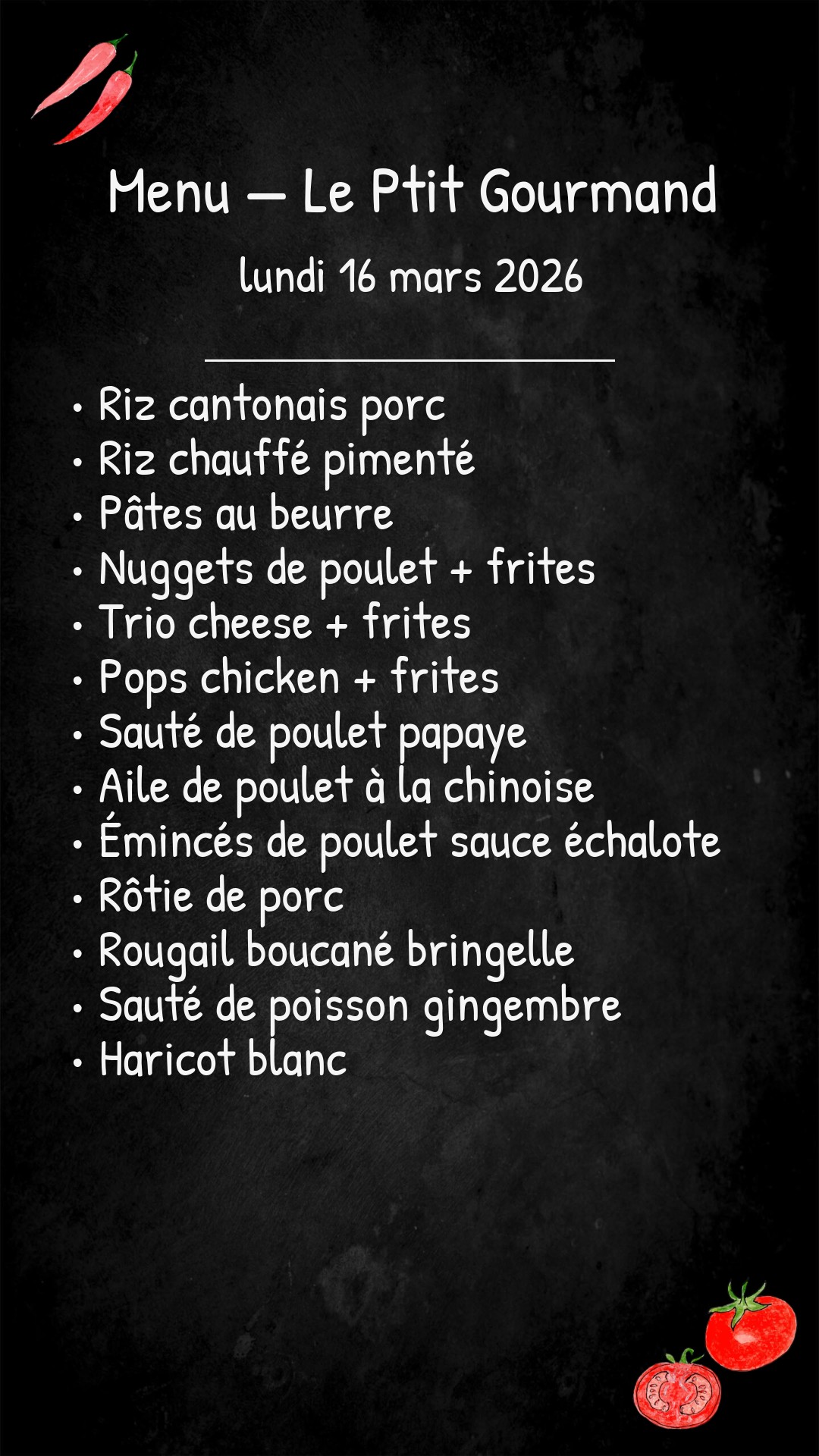 - Pops chicken + frites